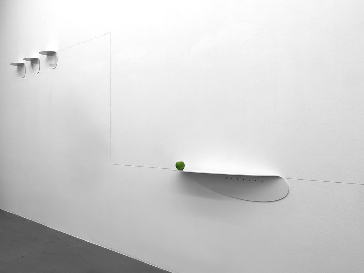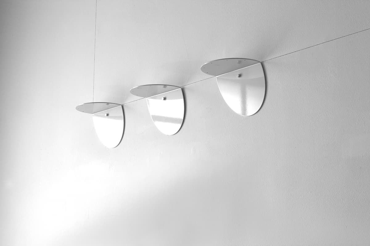 Le mensole disegnate da Santi Sircana sono solidi trampolini la cui filigrana è nella leggerezza dell’ombra che generano, la cui valenza estetica consiste anche nell’ombra che la luce esprime con esse.